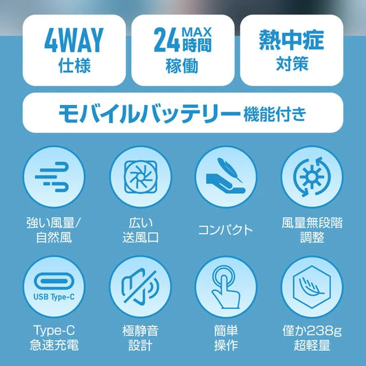 日本JP直送 6000mAh 手持頸扇,靜音,便攜,檯扇或坐扇 {11月30截單;預計10-14 工作天發貨}