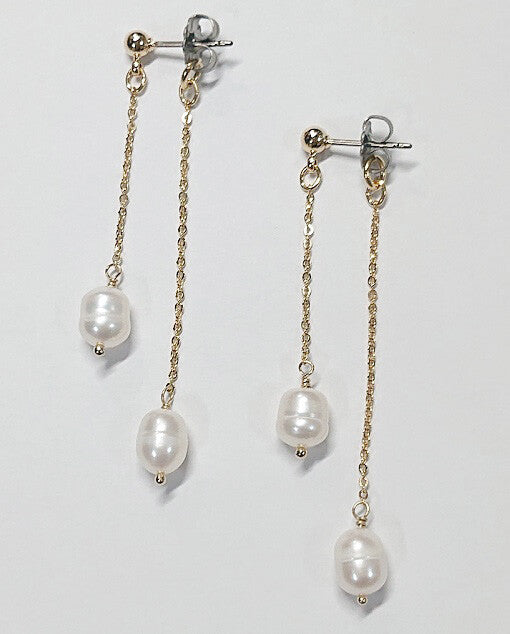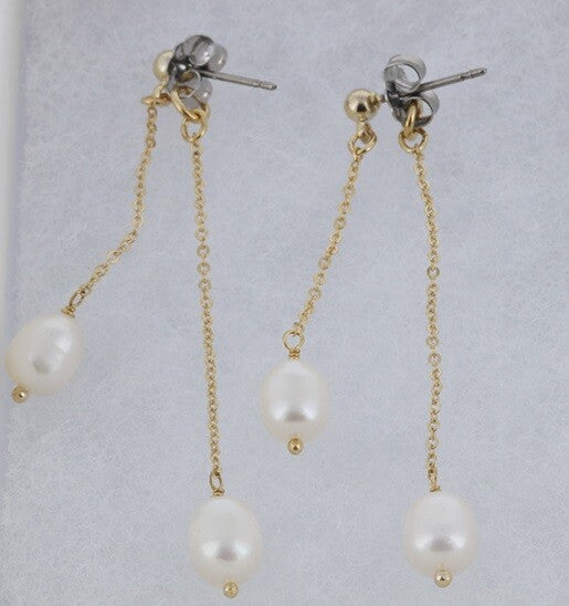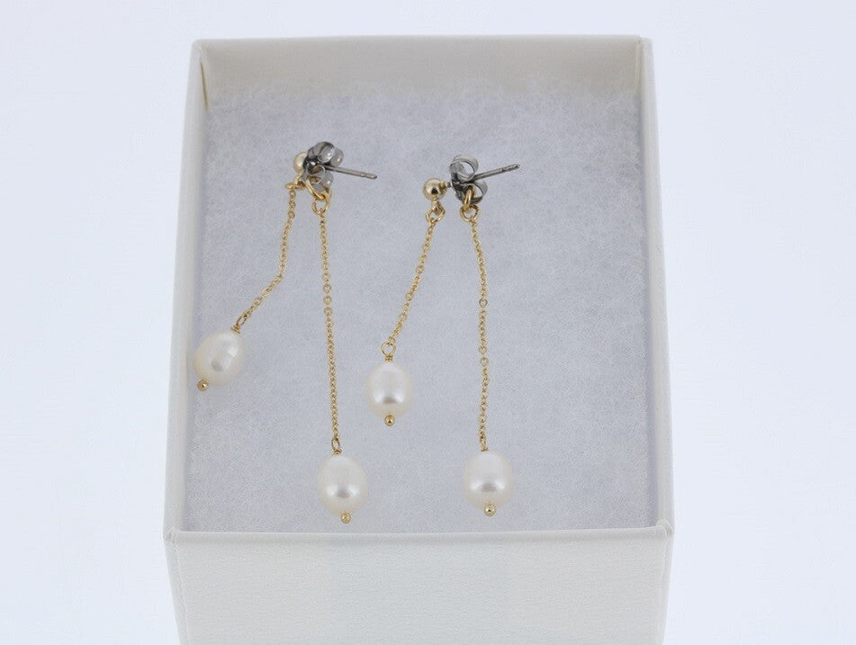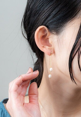 這款耳環的鏈條下方鑲嵌著淡水珍珠。垂直的長款設計讓珍珠能夠巧妙地垂墜。淡水珍珠的細膩形狀和色彩營造出精緻的氛圍。後扣設計讓您可以將其替換為您自己的標準扣,並將這款耳環視為簡單的單顆淡水珍珠。