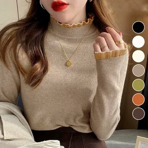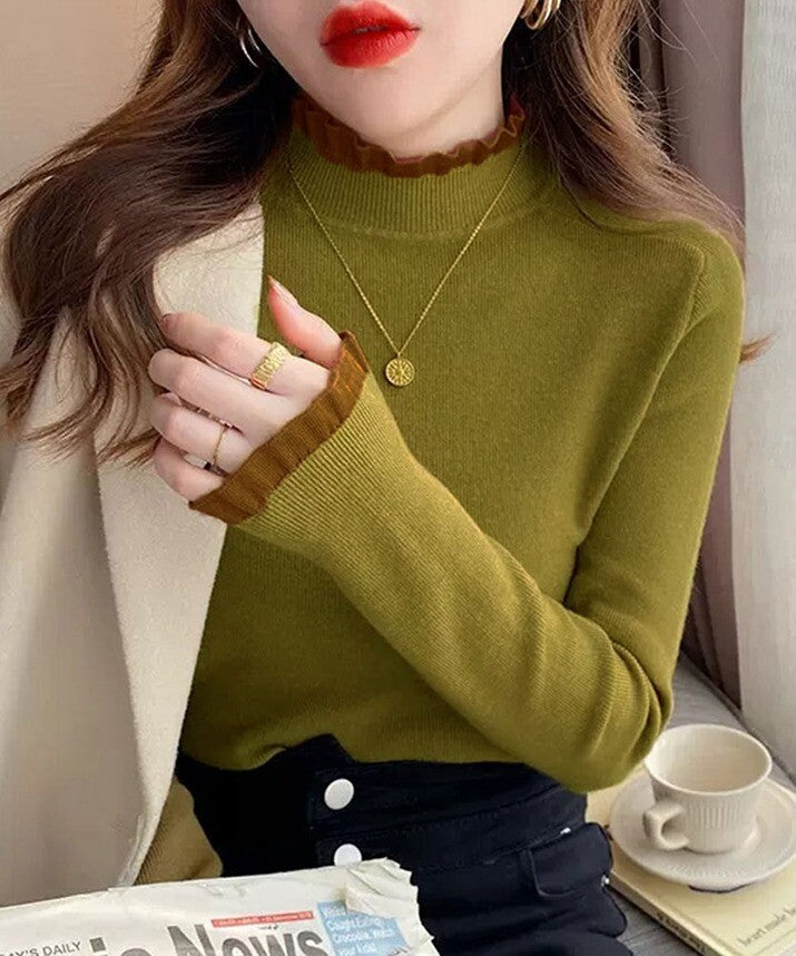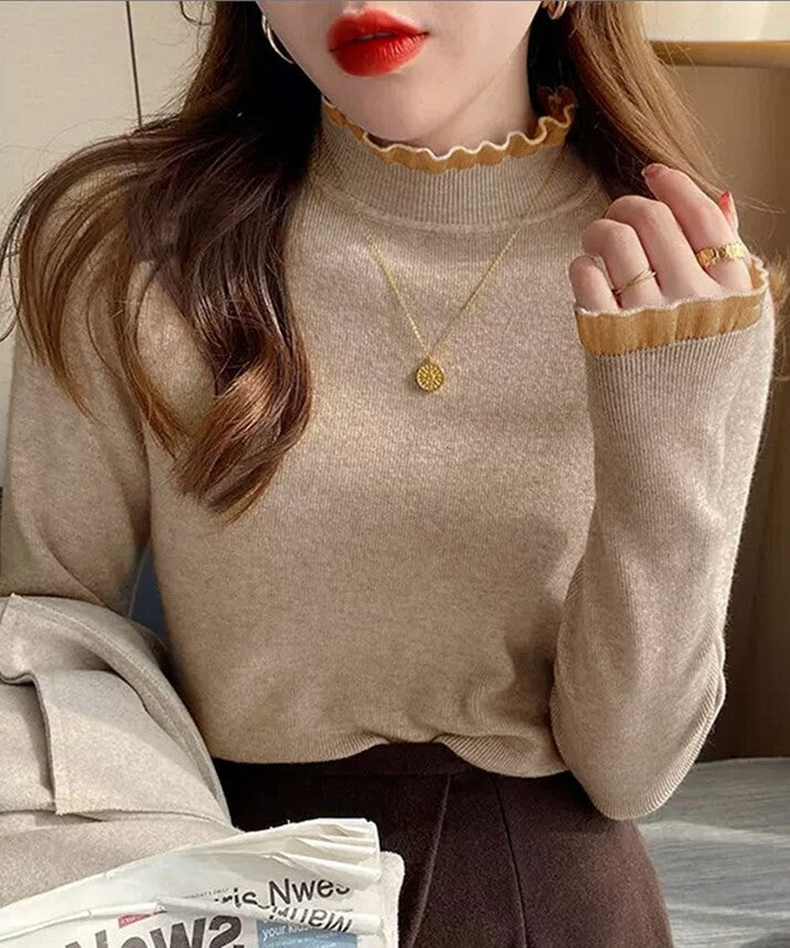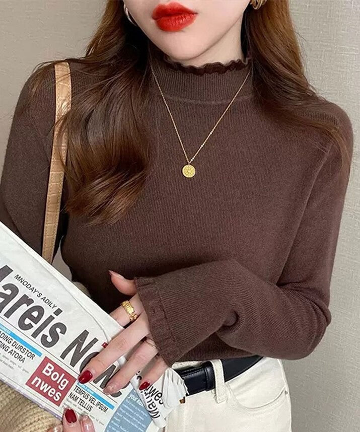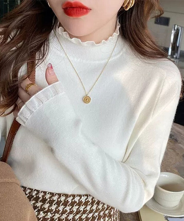 手感柔軟滑順的高領荷葉邊針織上衣。