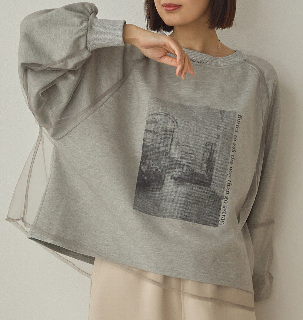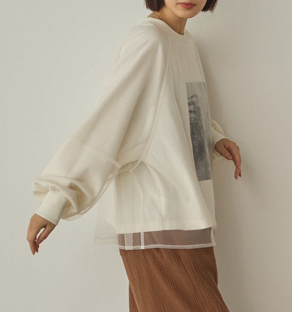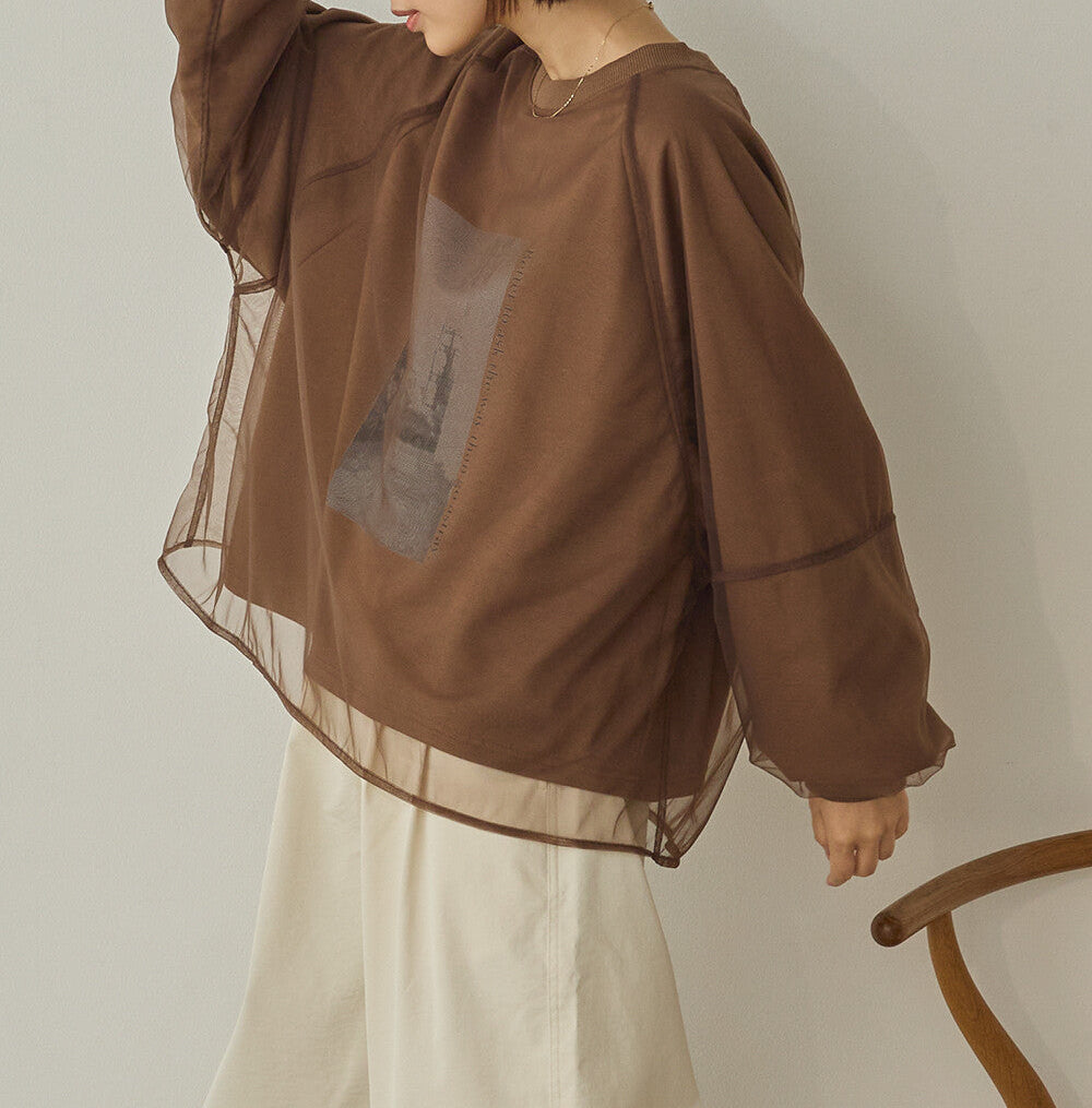 曰本JP直送 紗蕾絲層疊蓬鬆袖印花套頭衫{11月30截單;預計10-14工作天發貨}
