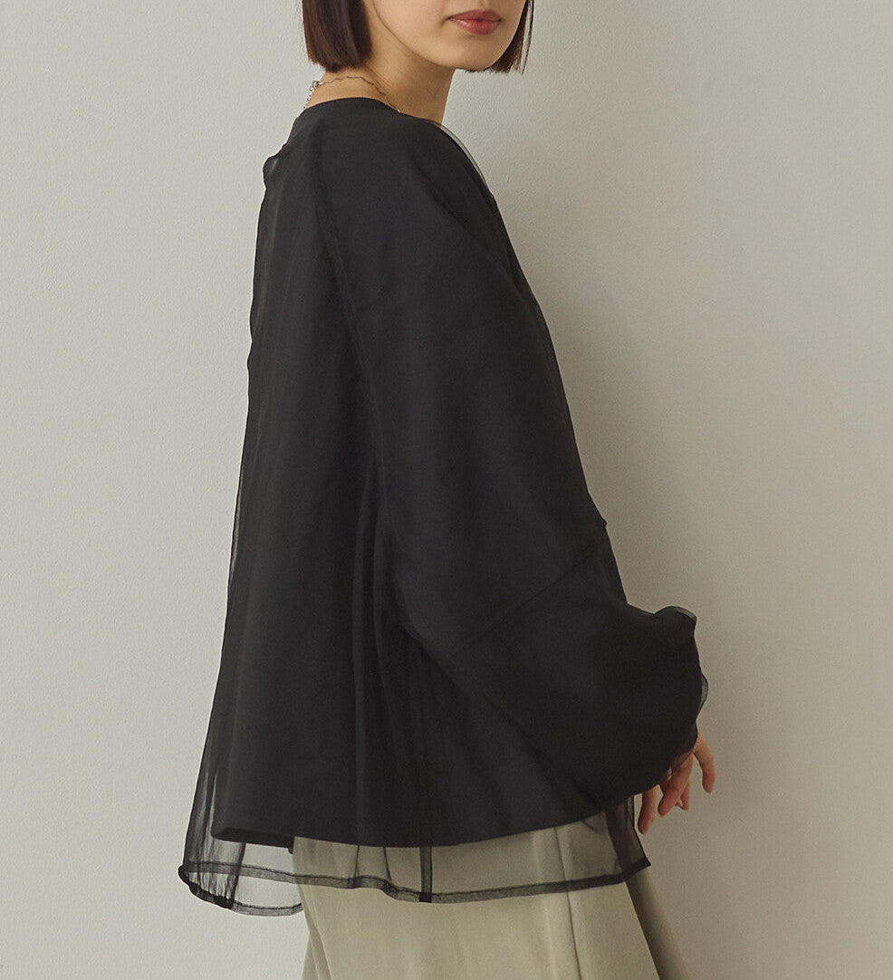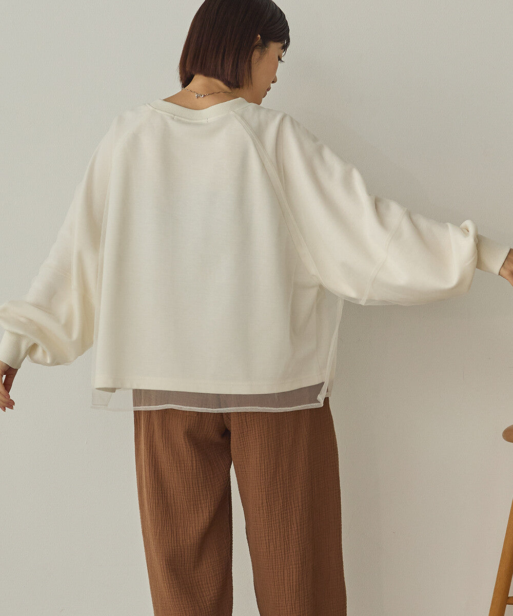更顯出女性優雅的氣質。蓬鬆豐盈的袖子更添魅力,使其成為一件可單獨穿著的點睛之筆。 它與休閒褲、半身裙和寬腿褲完美搭配。 寬鬆的輪廓凸顯身材, 輕盈舒適的穿著體驗使其成為換季穿著的理想選擇。 這款成人層疊套頭衫兼具時尚與柔和的風格。