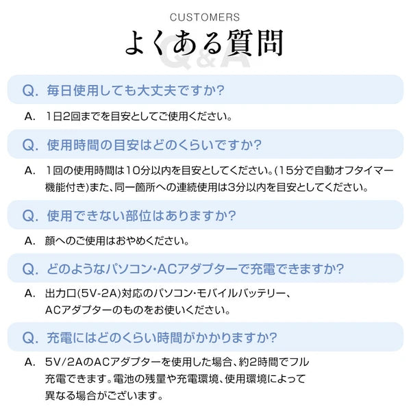 配備大容量1800mAh電池,可連續使用約5小時。無需頻繁充電。 *為防止過度使用,設備將在使用 15 分鐘後自動關閉。