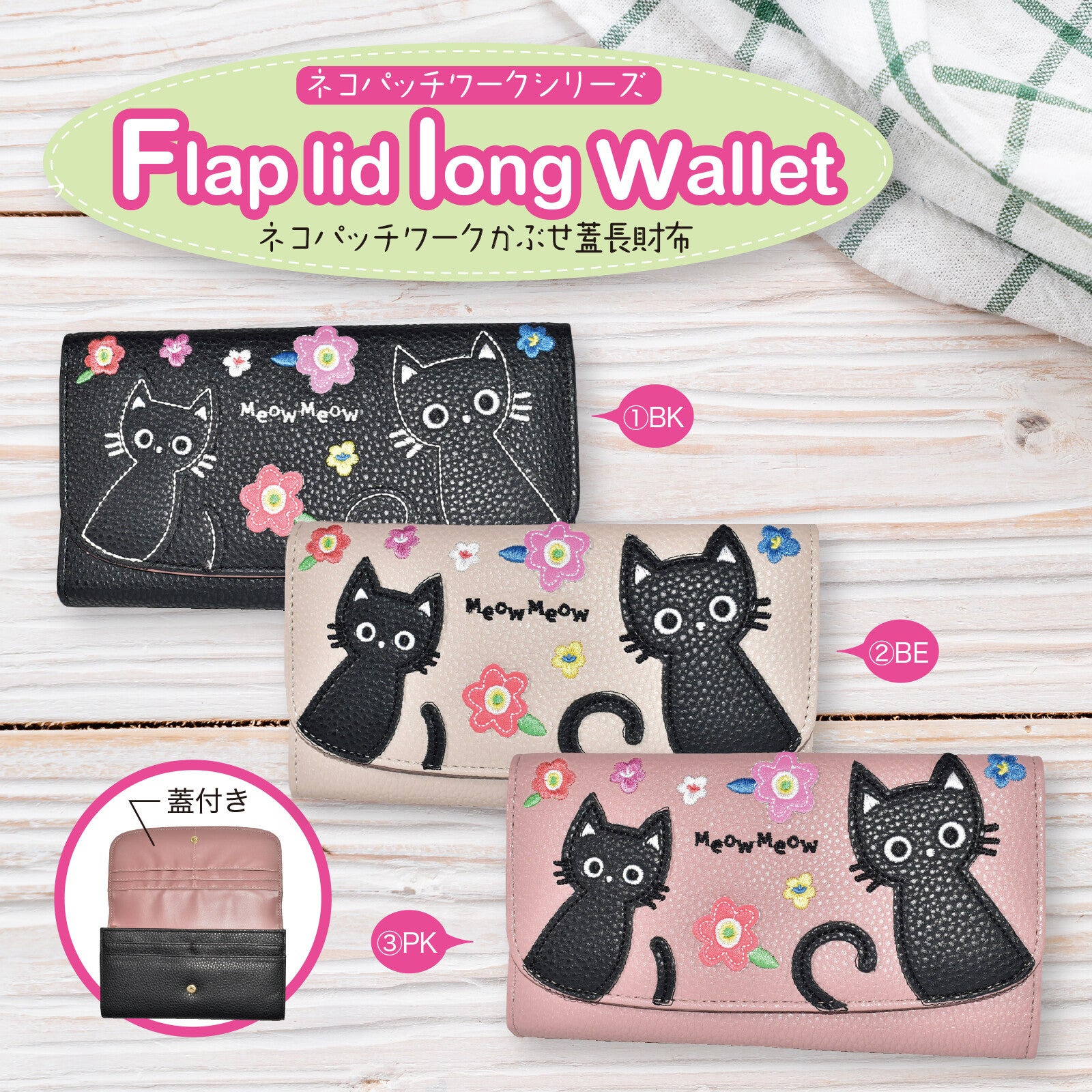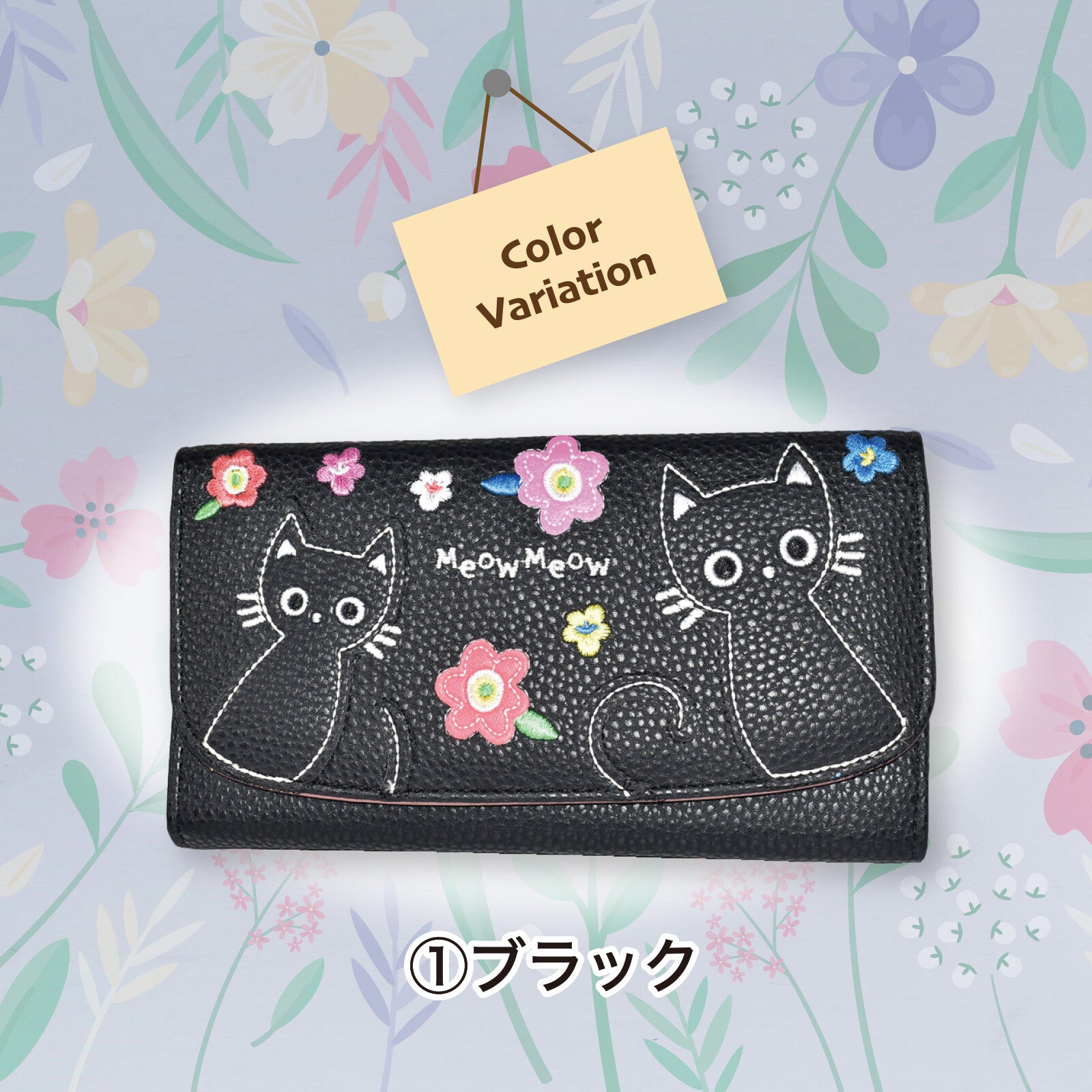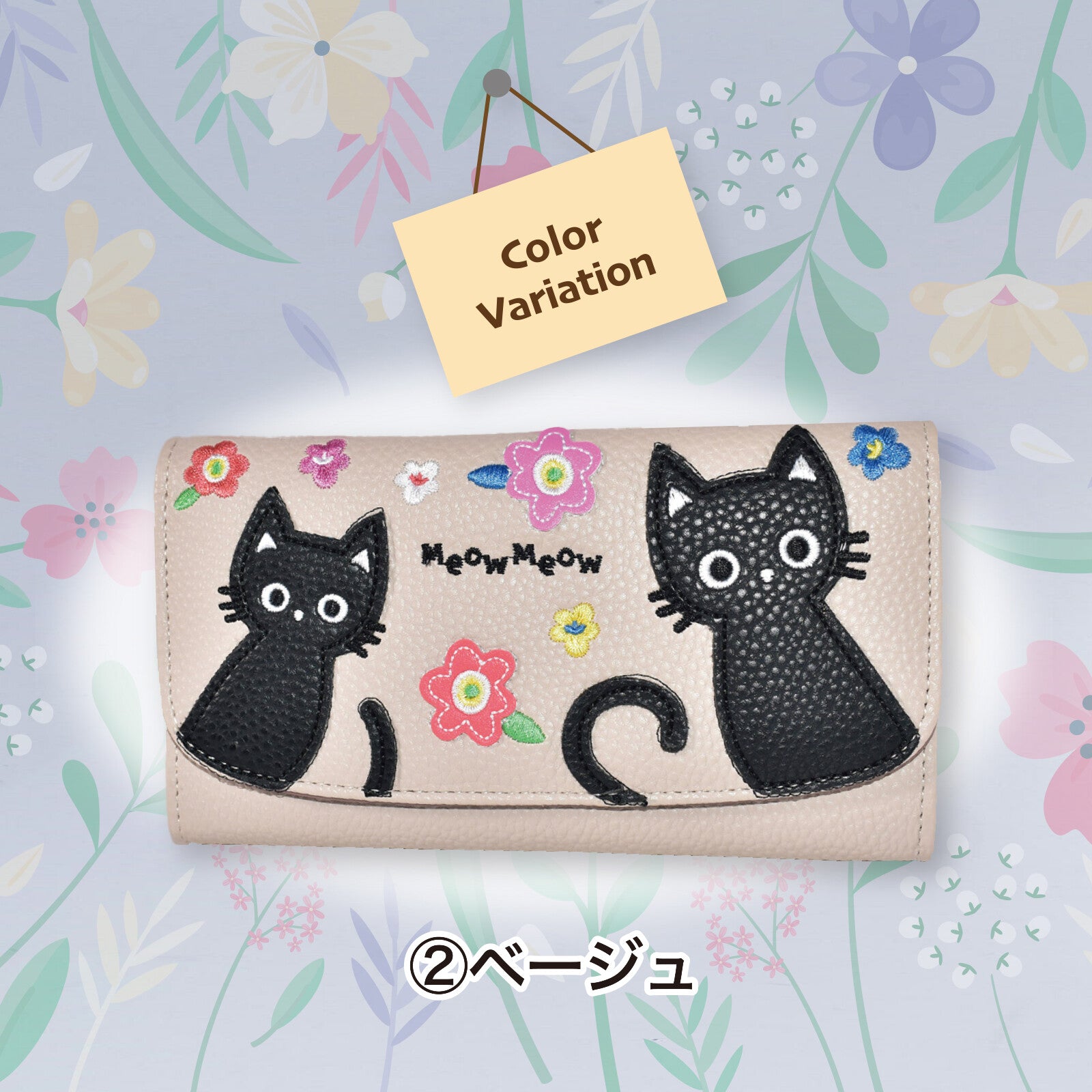 ◆一款長版皮夾,飾有可愛的貓咪圖案拼接設計。