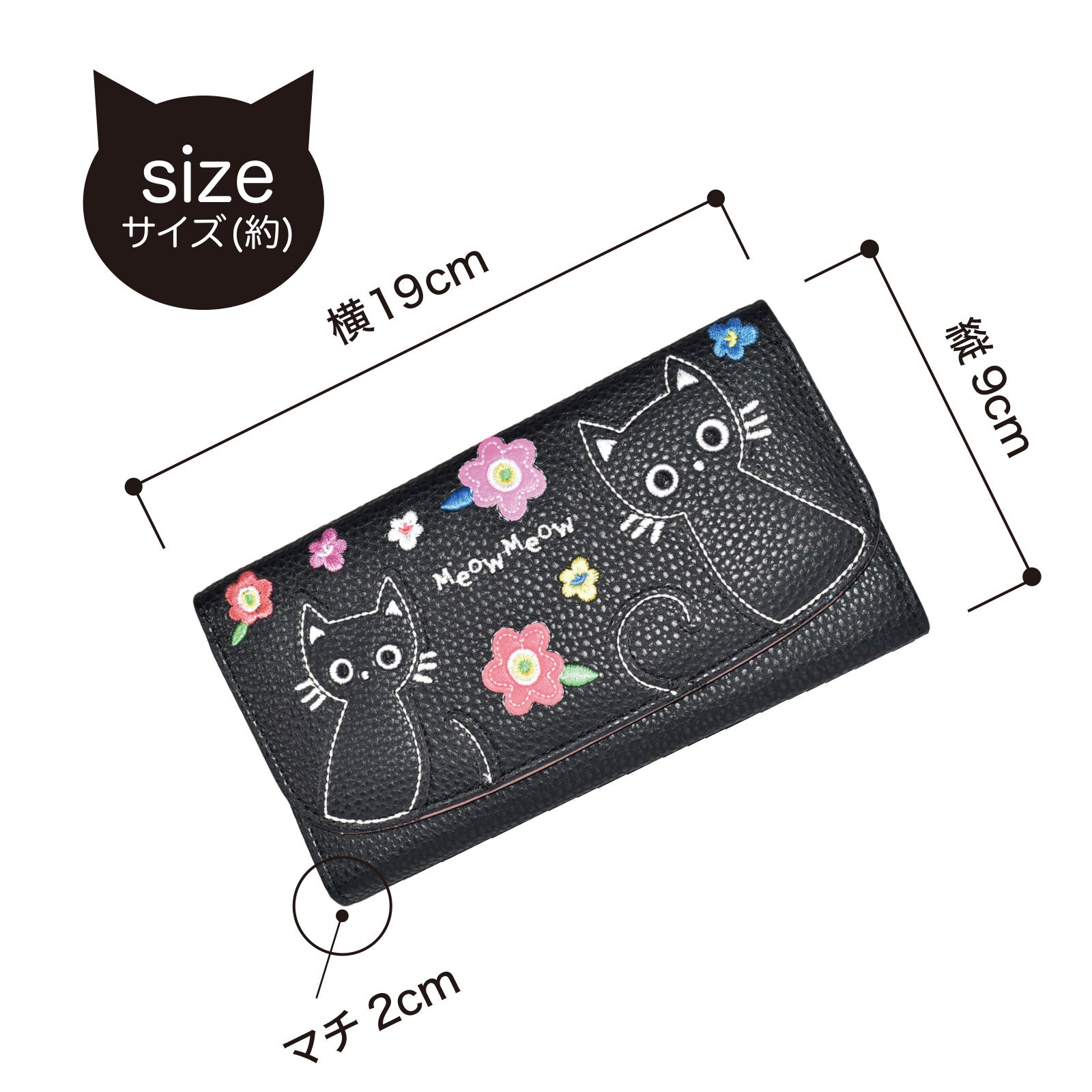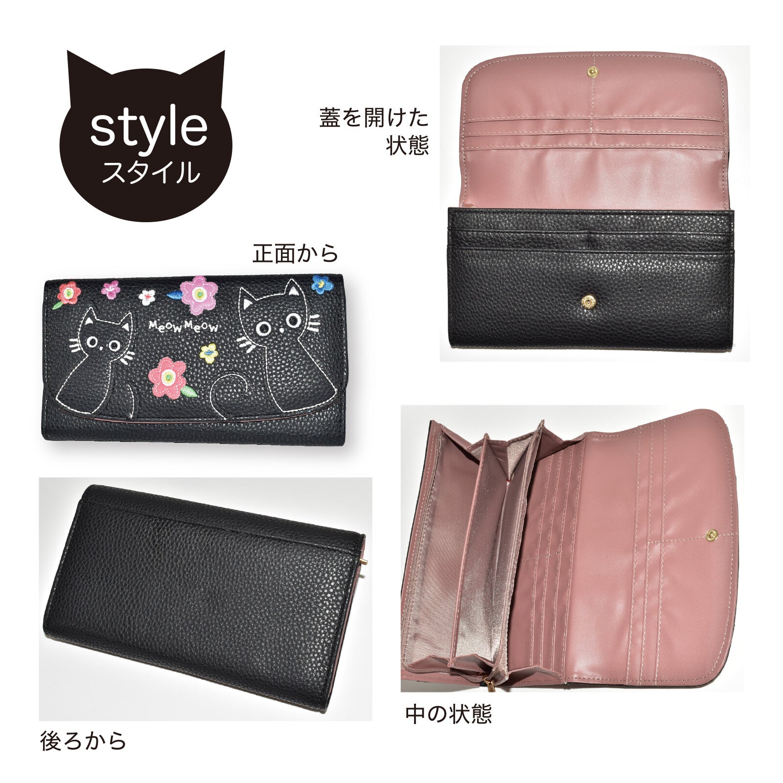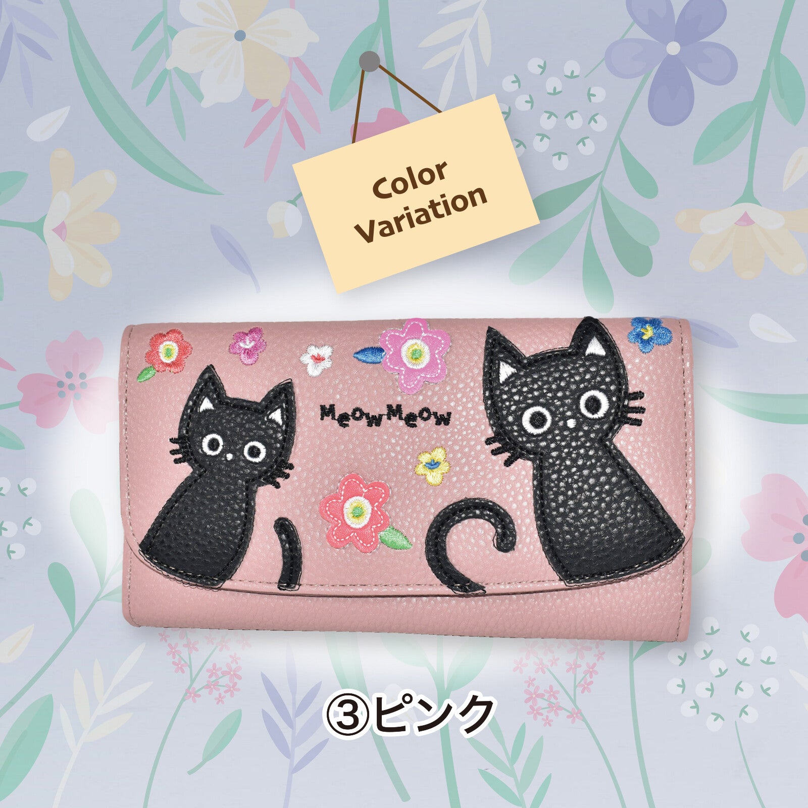 ◆一款長版皮夾,飾有可愛的貓咪圖案拼接設計。