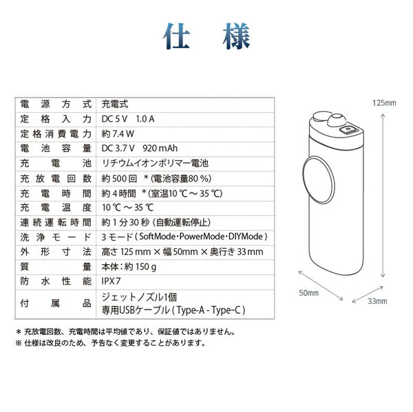 規格: Regalino 口腔沖洗器噴射沖洗 。製造商:Regalino 。產品名稱:口腔沖洗器噴射沖洗 。型號:RG-CB135-W 。顏色:白色 。尺寸:50mm 寬 x 33mm 深 x 125mm 高。重量:約 150 公克(單位) 。電源:可充電(USB 充電) 。防水等級:IPX7 。水箱容量:約 90 毫升 。原產國:中國。 |